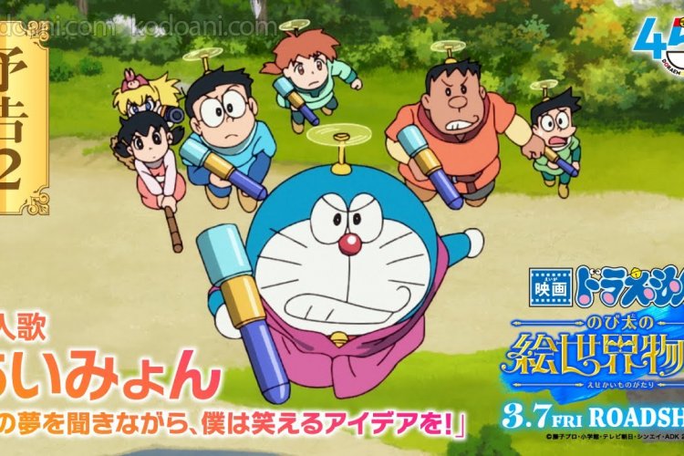 Kodoani.com – Toho has just released the second trailer for Eiga Doraemon: Nobita no Esekai Monogatari (The story of Nobita's painting world), the 44th movie in the Doraemon series. Notably, the trailer revealed the song of the film called “Kimi no YuMe o Kikinagara, Boku Wa Wareru Idea O!” (An idea that makes me smile to me, while I listen to your dreams!) Aimyon presented.
